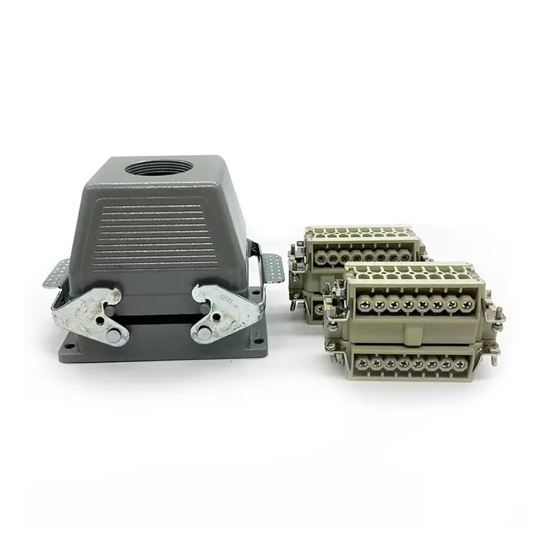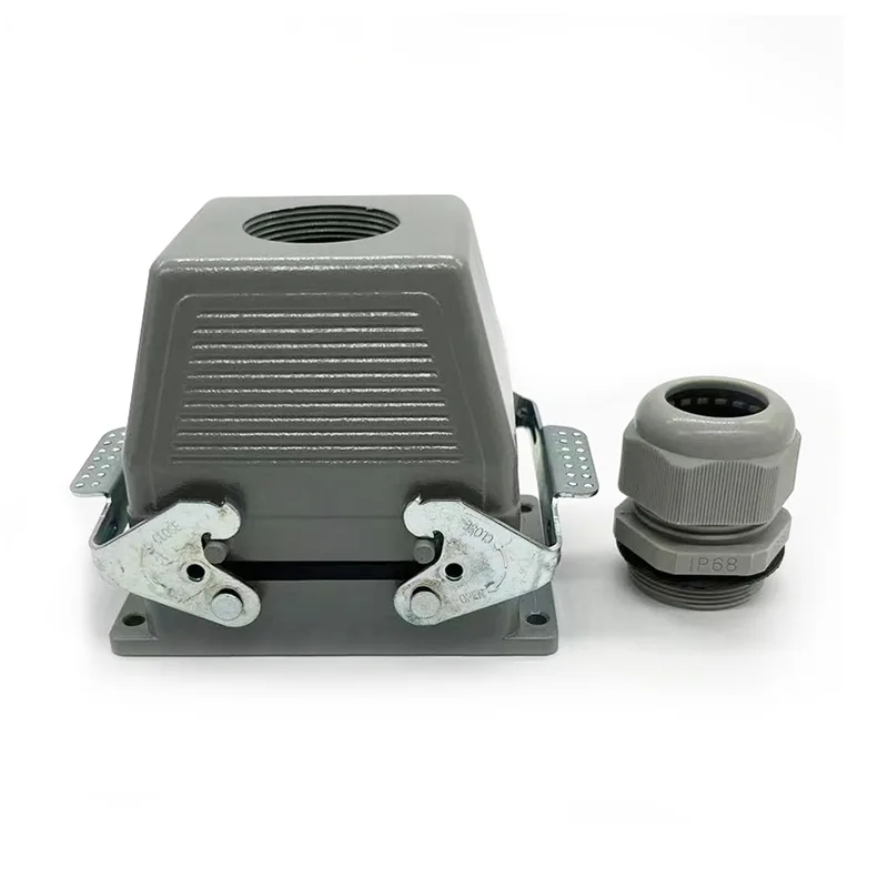32-kolíkové konektory TG Heavy Duty sú samčí horná časť krytu. Mala by sa spracovať s samčími vložkami alebo samičími vložkami. Normálne bude upevnený dvoma kusmi HE-016-M, ale niektorí špeciálni zákazníci žiadajú montáž s dvoma kusmi HE-016-F. Je to tiež puzdro pre HSB-016. Vodotesnosť IP65 z neho urobila to, čo sa dá použiť vonku. 32-kolíkové konektory TG Heavy Duty sú zladené s PG29. Ak majú zákazníci rôzne požiadavky na veľkosť káblových priechodiek, môžeme prijať a objednať výrobu.