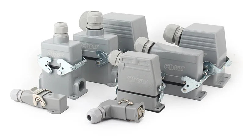 CHTARmôže poskytnúť celý rad vysokovýkonných konektorov. K dispozícii sú kryty, ktoré zodpovedajú HA, HE, HD, HEE a HDD atď. Pracujú tiež s rôznymi kolíkmi, ako sú 3, 4, 5, 6, 10, 16, 24, 32 a 48 atď. Z výroby je možné dodať rôzne smerové pripojenia vodičov.