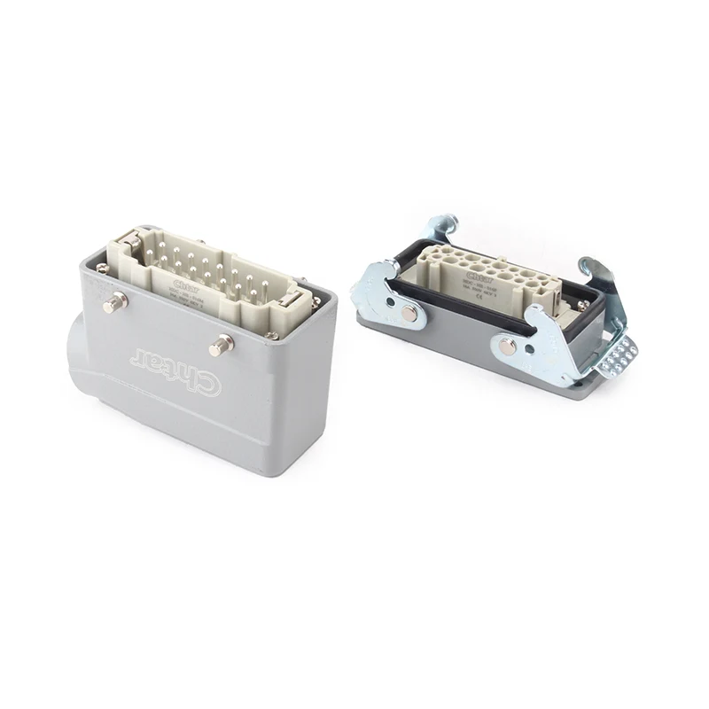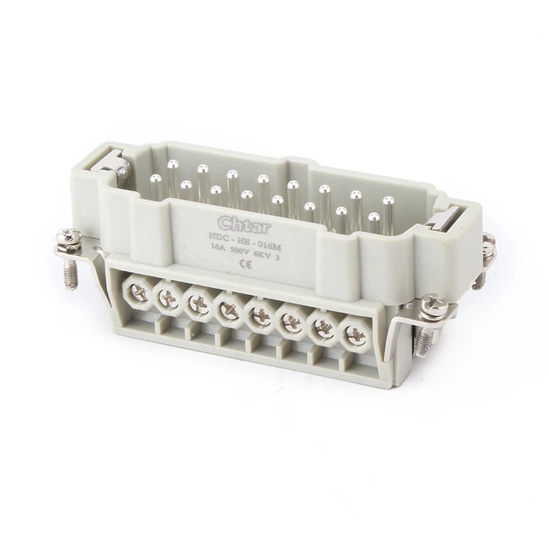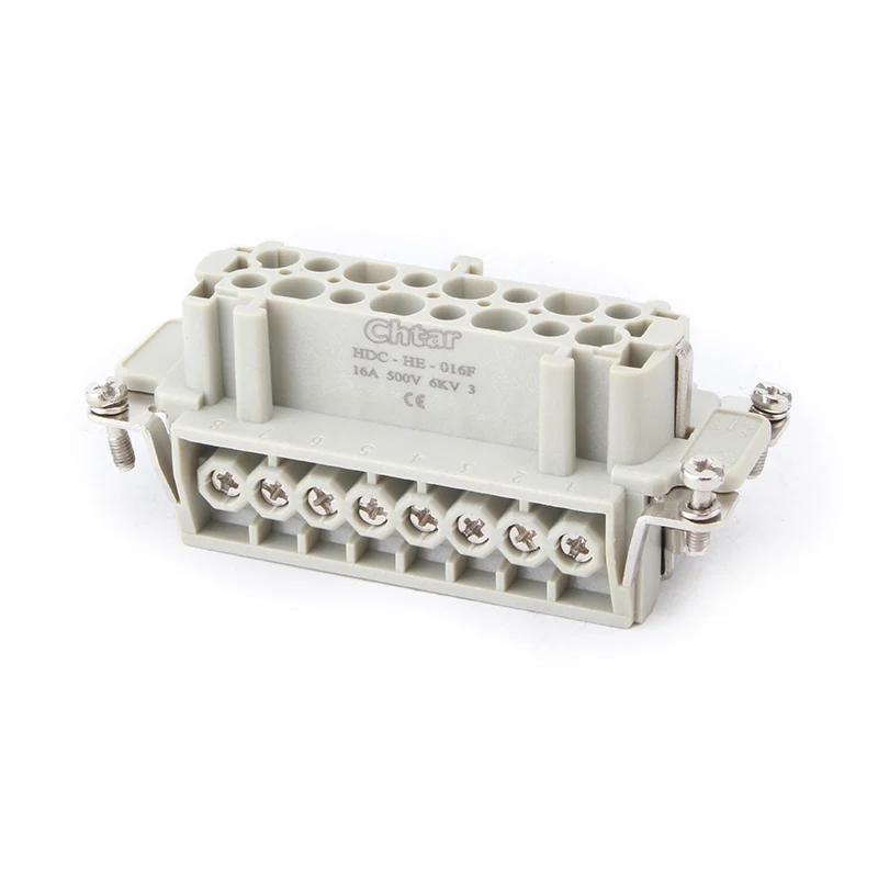 Pokročilý zásuvný vysokovýkonný konektor 16A HE-016-F/M od CHTAR je 16-kolíkový konektor M/F s vložkou pre vysoké zaťaženie. Má mužskú a ženskú časť. Je kompatibilný s odolným konektorom H16B. Zvyčajne je samčí komponent namontovaný v samcom kryte alebo môže byť zostavený do vonkajšieho komponentu na spätnú inštaláciu podľa požiadaviek zákazníka. Pevný materiál krytu PC a postriebrené mosadzné kolíky zaisťujú vodivosť a prevádzkové výhody 16-kolíkového zásuvného konektora M/F pre veľké zaťaženie.