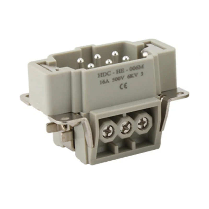 Konektory M/F 6-pin Insert Heavy Duty konektory pracujú pod prúdom 16A. Je to 16 kolíkov na kontakt s drôtmi. Ponúka sa pre rôzne pracovné podmienky a je obľúbený v automatickom priemysle a pri druhoch zapojenia stroja.